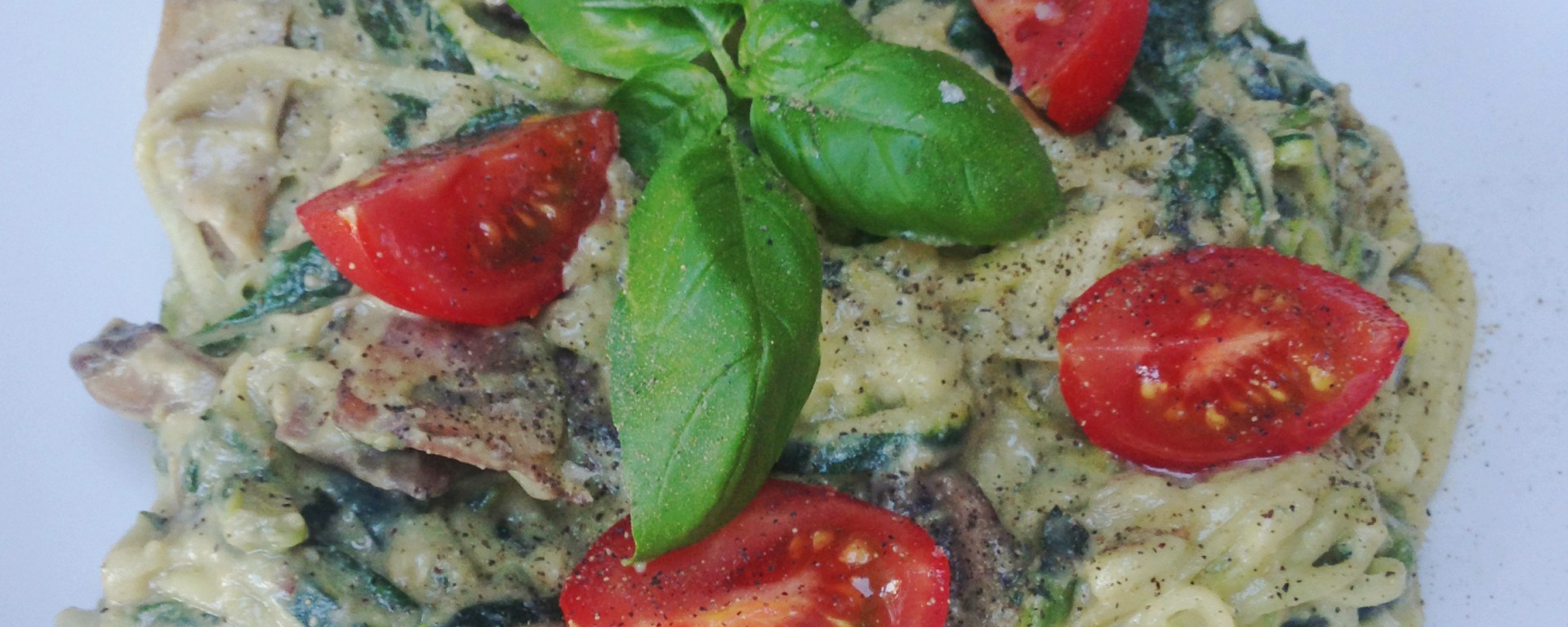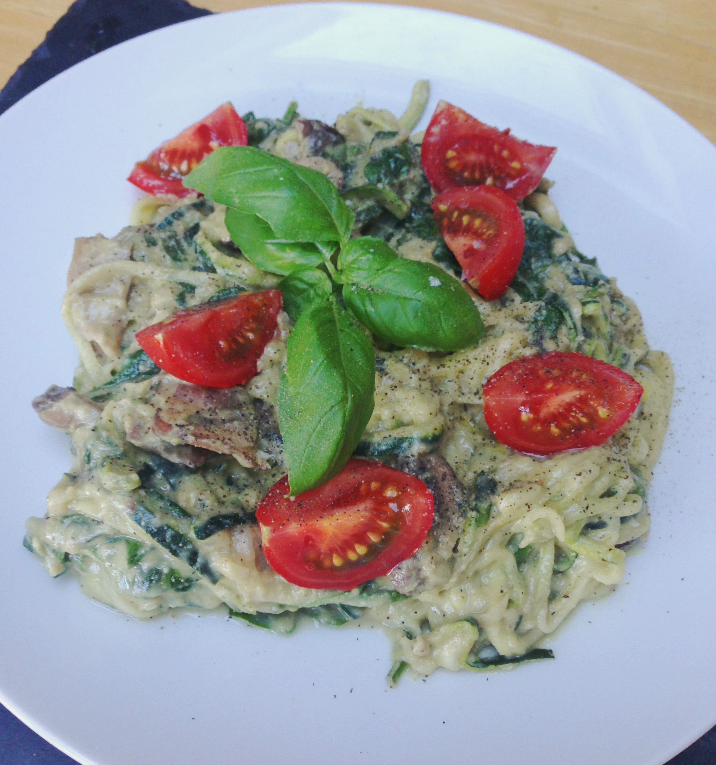 And, voila! I added my spinach to the pan during step 5, and my chopped tomatoes once the courgetti was on the plate. This is more of a challenge than it sounds – transferring creamy courgetti (that seems to go on forever) from a large pan to a plate is not such an elegant sight…