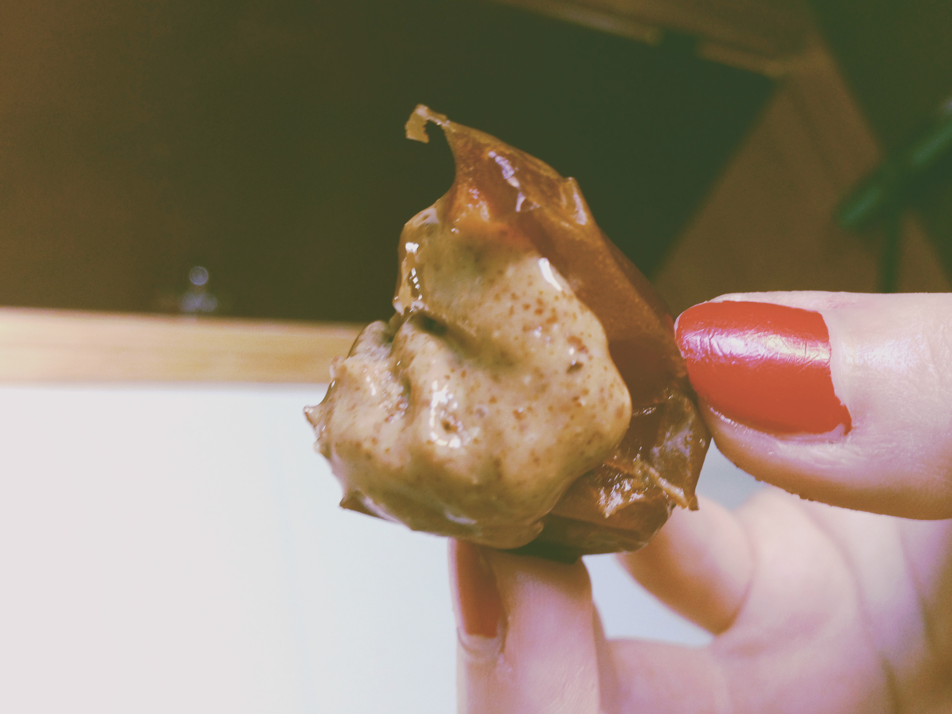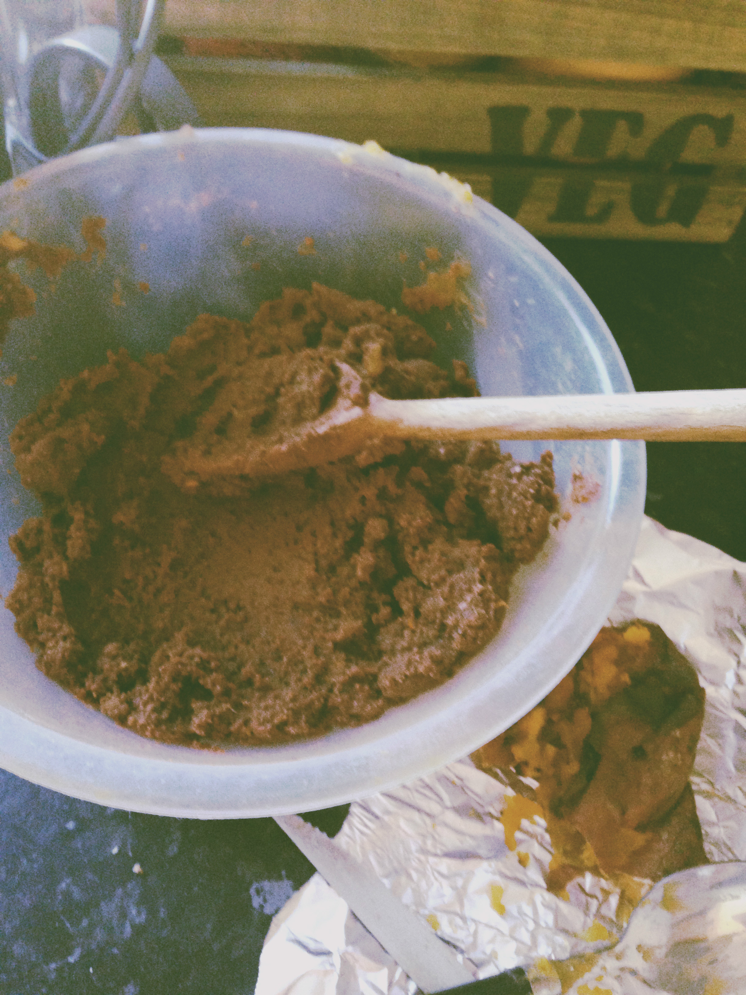 1) Ella’s recipe tells you to peel the sweet potatoes, cut them into chunks, and steam them for 20 minutes. However, I baked my sweet potatoes with the oven on 180 Celsius for 45-60 minutes whilst I was prepping the rest of the recipe/eating dates with almond butter/watching Bake Off. This way, I didn’t have to peel the potatoes because it was so easy to scoop the flesh out once they had been baked. It also meant I could snack on the sweet potato skins afterwards! (Yes, I did snack on dates too, but that’s the point of baking right?!)