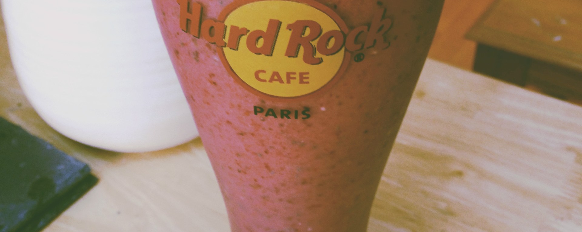 I have just got back from an amazing weekend in Paris, so this smoothie was an attempt to cure my post-holiday blues this morning. I do this weird thing where I buy a Hard Rock Cafe glass from all of the cities that I’ve visited… Jenna is nice enough to let me line them all up on the windowsill.