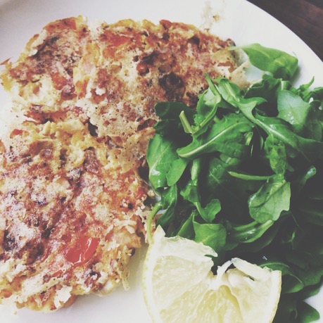 I used a few cherry tomatoes left over from the lasagne, rather than one plum tomato. And I also used Grana Padana rather than Parmesan because it’s much cheaper!