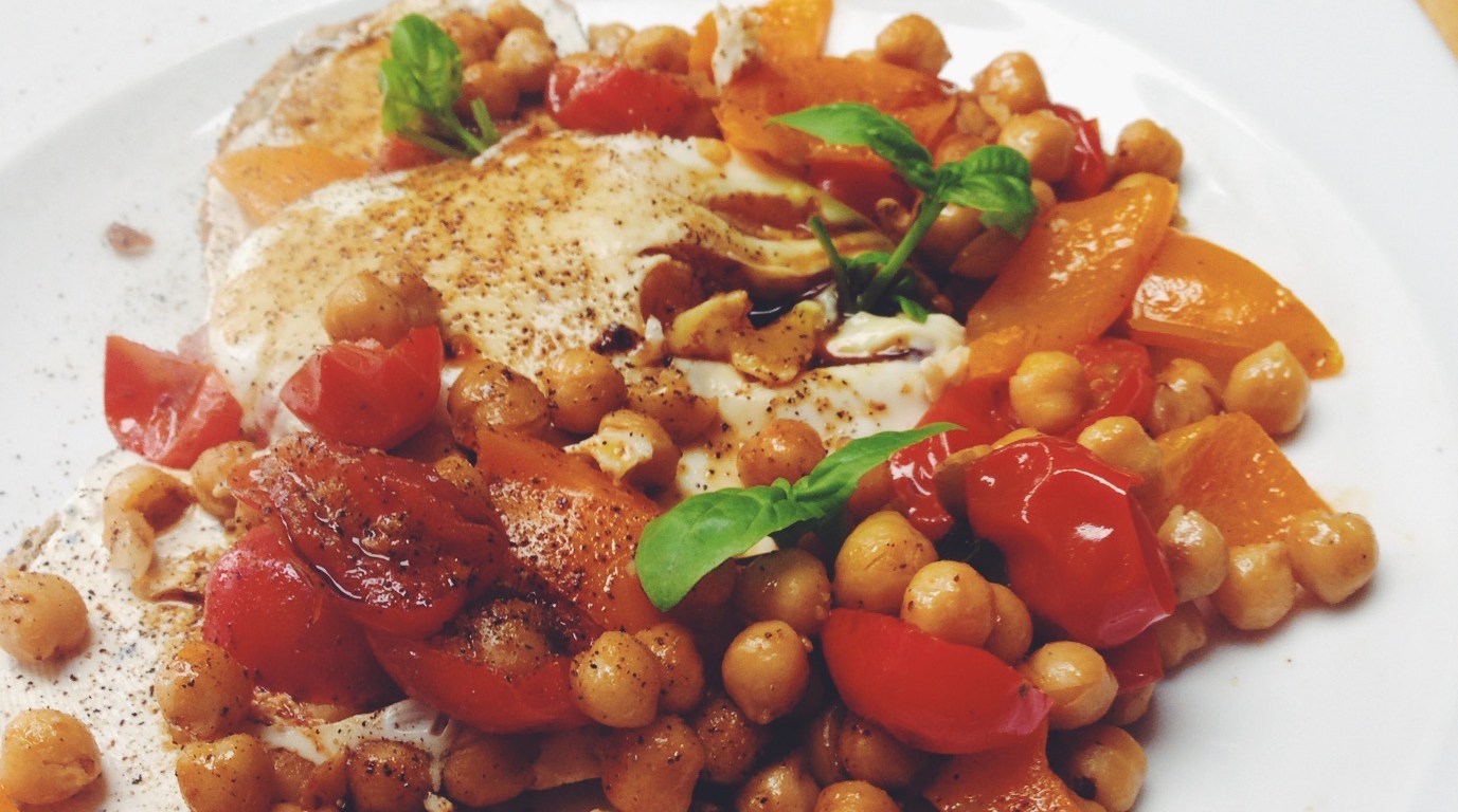 Shopping list: 250g cherry tomatoes, 1 pepper, half a lemon, fresh basil, 400g tin of chickpeas, eggs, seeded wholemeal bread, cream cheese.