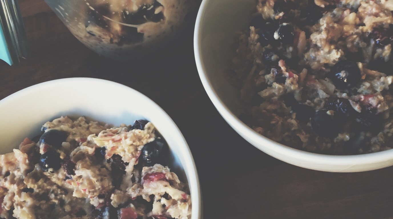 Shopping list: 1 apple, 45g oats, 40g dried cranberries (or raisins), 15g sunflower seeds, chia seeds, 125ml coconut milk, maple syrup, a handful of berries (I went for blueberries)