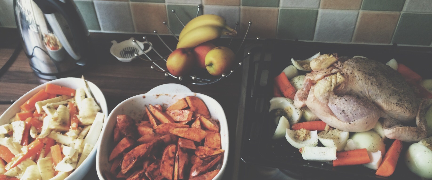 Place the chicken on top of the veg. Turn the oven down to 200 degrees Celsius and put the baking tray into the oven. There is usually a guide of how long to cook the chicken for on the packaging (my 1.6kg bird took 1 hour and 20 mins). If you’re doing roast potatoes and veggies, now is the time.