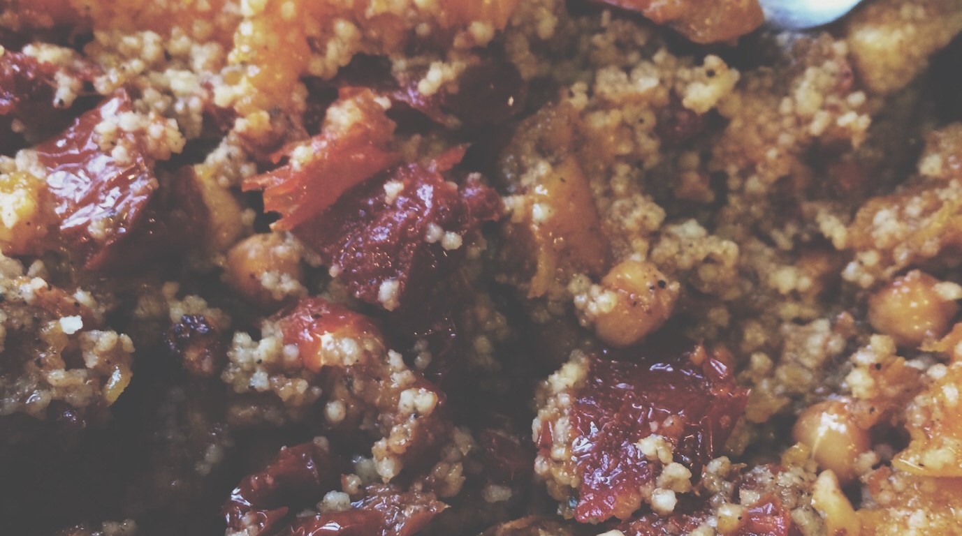 Shopping list: 1 butternut squash, 400g tin of chickpeas, 250g jar of sun-dried tomatoes, 100g rocket, paprika, mixed herbs, chilli powder, balsamic vinegar, couscous (or any other grain).